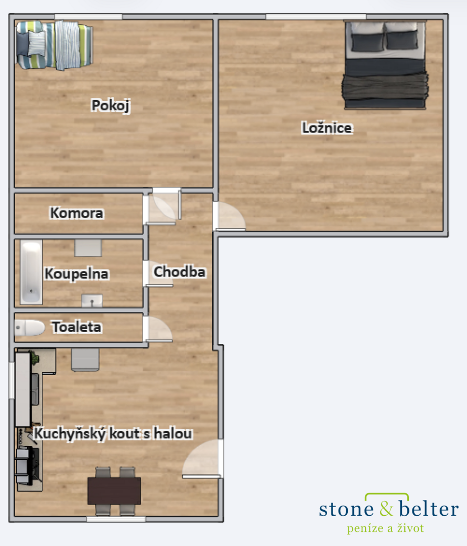 Dispozice je praktická a funkční: obývací pokoj, samostatná ložnice, kuchyň s halou, koupelna, samostatné WC, komora a vstupní chodba.
