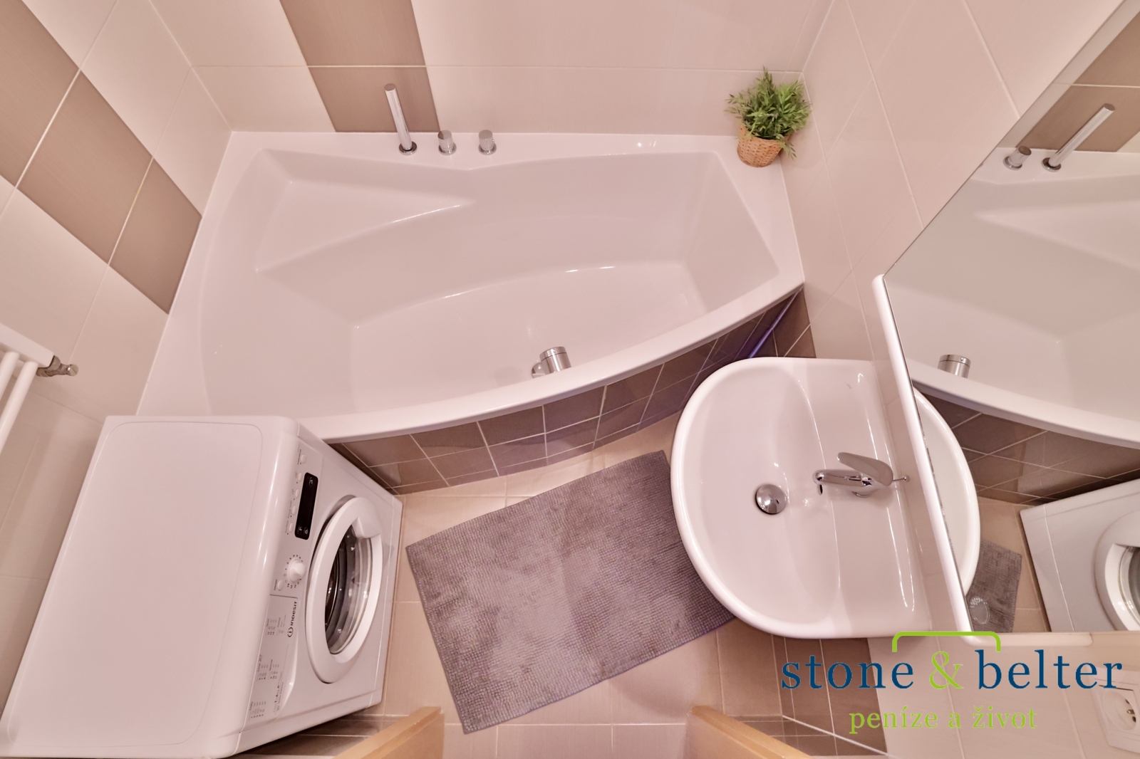 Byt je vybaven kuchyňskou linkou s vestavnými spotřebiči a úložnými prostory. Ložnice je bez postele. Koupelna je vybavena vanou, WC je samostatné.