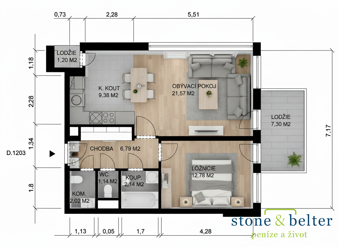 Celková plocha bytu činí 57 m². K bytu náleží lodžie o velikosti 7,30 m² a 1,20 m² a sklep o velikosti 5 m².