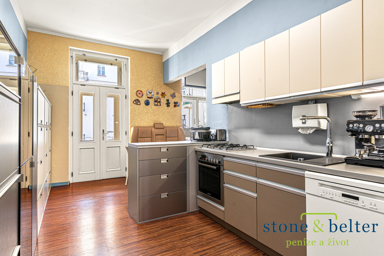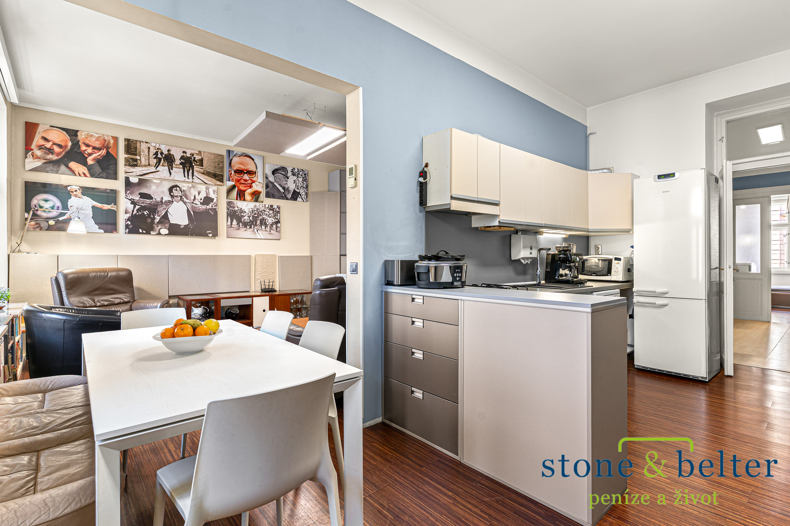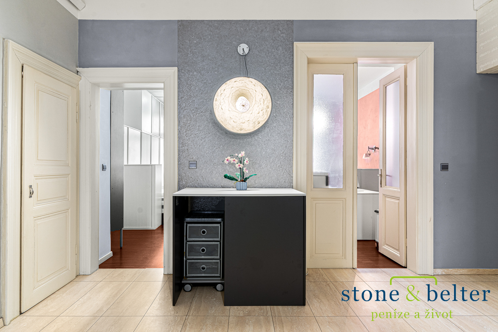 Rekonstrukce bytu citlivě pracuje s původním charakterem prostoru a současně nabízí standard odpovídající dnešnímu bydlení.