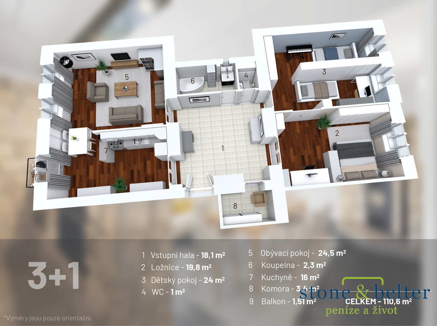 Nabízíme k prodeji nevšední byt 3+1 nacházející se ve 3. NP cihlového domu v ulici Zborovská na Praze 5 – Smíchov. Byt má podlahovou plochu 111 m² a tvoří jej vstupní chodba (18,1 m²), kuchyně (16,2 m²), obývací pokoj (24,51 m²), dva pokoje (24,1 m² a 19,8 m²), koupelna (3,4 m²), samostatné WC (1,2 m²), technická místnost (3,4 m²). K bytu náleží balkon o výměře 1,5 m².