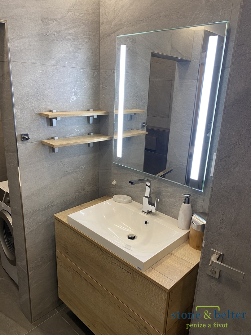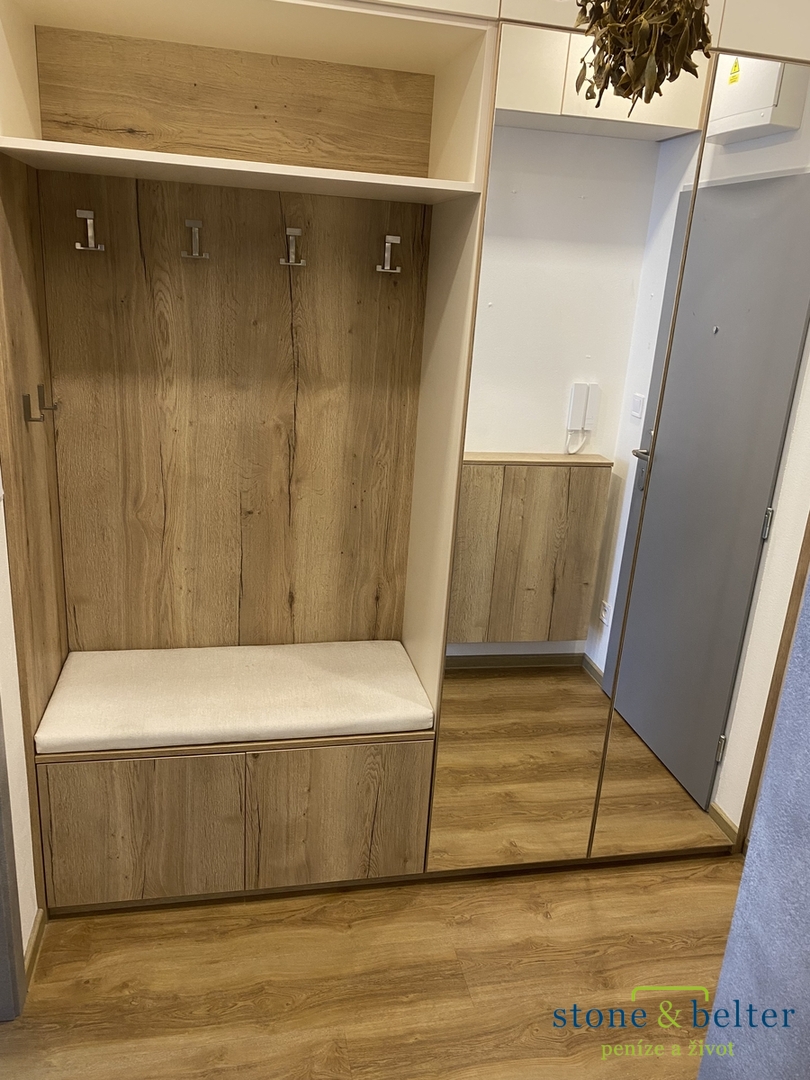 Celý byt je kompletně vybaven - vestavěný nábytek, pračka, sedací souprava, jídelní stůl, TV, vysavač, kuchyňské spotřebiče, základní nádobí.