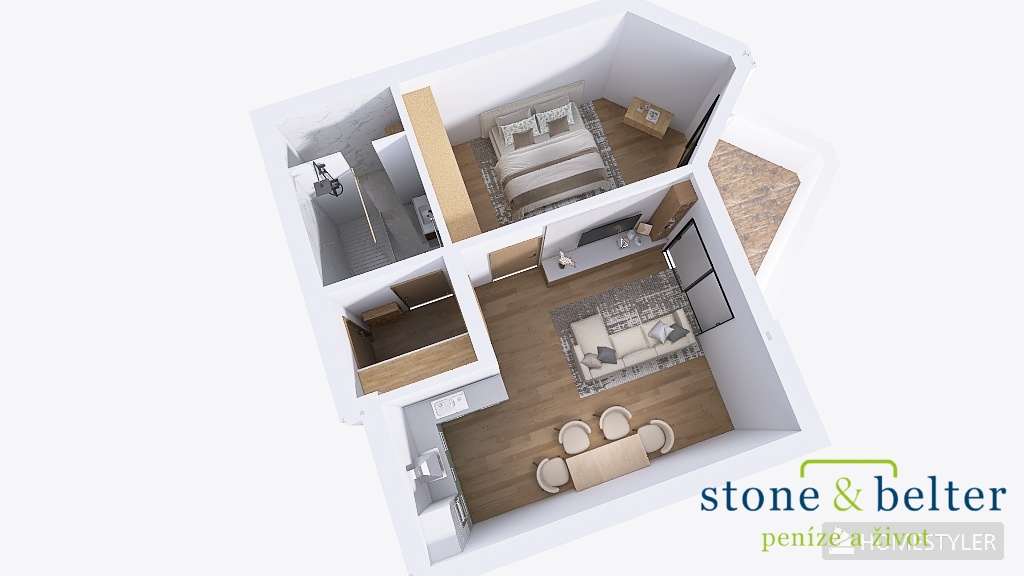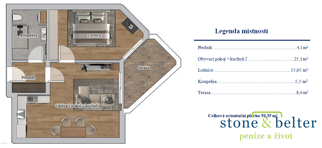 Byt se skládá z obývacího pokoje s kuchyňským koutem (25 m²), ložnice (16 m²), koupelny s toaletou (6 m²), vstupní chodby (4 m²). K bytu dále náleží kryté parkovací stání.