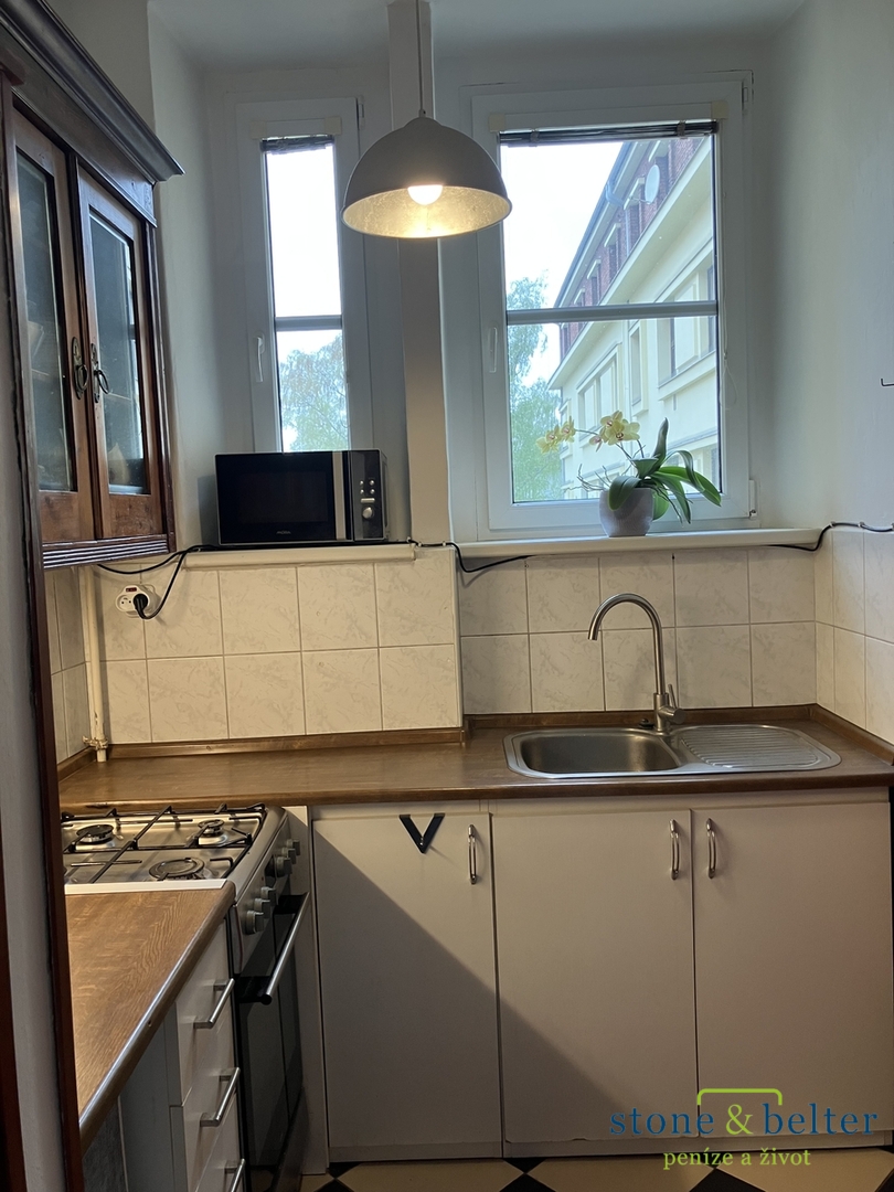 Byt zůstane částečně vybaven - lednice, sporák, mikrovlnná trouba, pračka, konferenční stolek, jídelní stůl a židle, úložná sestava v obýváku a šatní skříň v ložnici.