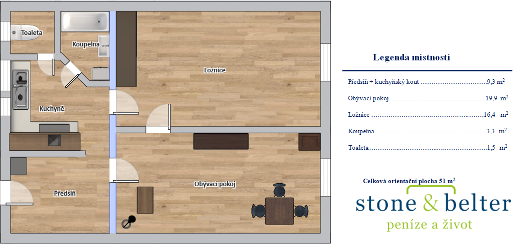 Byt se skládá z předsíně a kuchyňského koutu (9,3 m²), obývacího pokoje (19,9 m²), ložnice (16,4 m²), koupelny (3,3 m²) a toalety (1,5 m²).