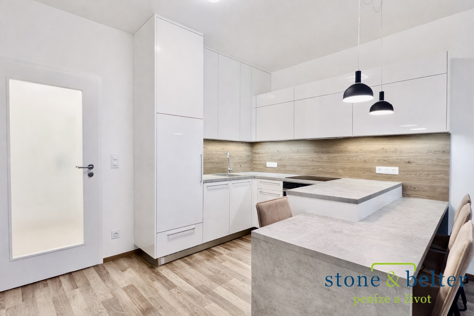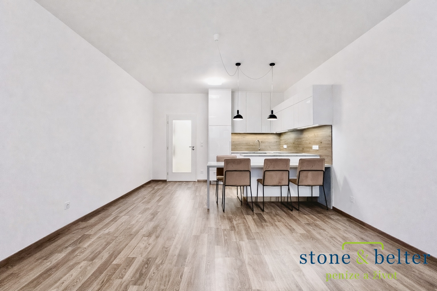 Dominantou bytu je světlý obývací prostor s kuchyňským koutem o velikosti cca 28,9 m², který poskytuje dostatek místa jak pro relaxaci, tak i pracovní zónu. Kuchyňská linka je plně vybavena – k dispozici je sklokeramická varná deska, elektrická trouba, vestavná myčka nádobí, digestoř a dostatek úložných prostor. Na kuchyň navazuje praktický jídelní pult.