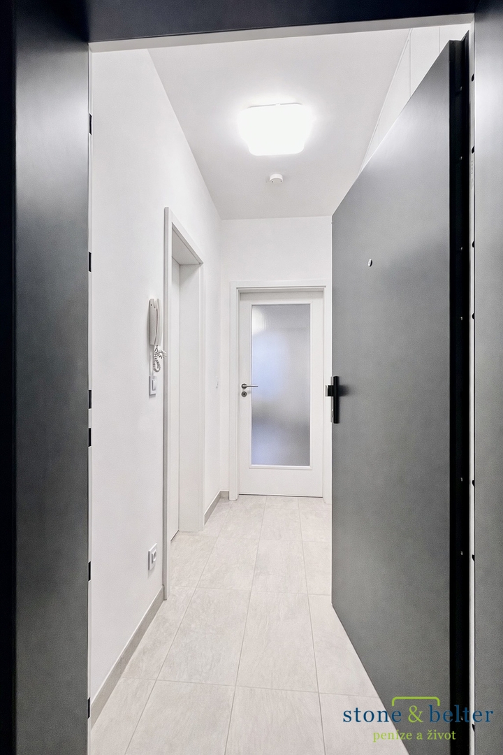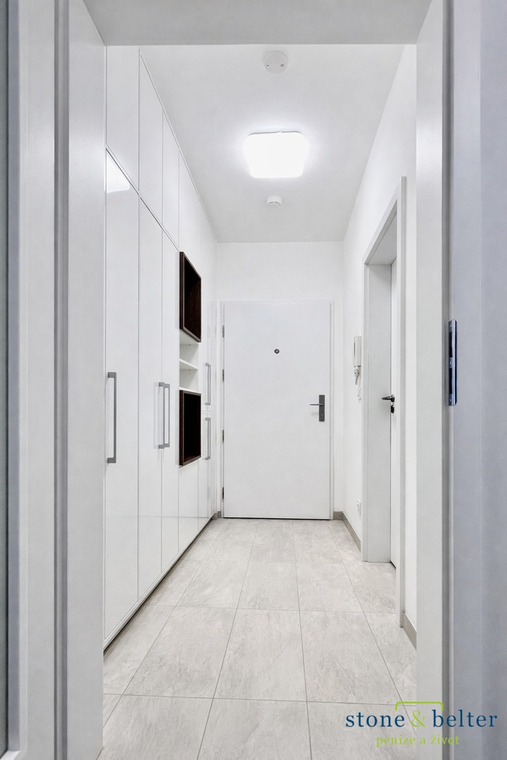 Dále je k dispozici předsíň (cca 4,0 m²) s vestavěnými skříněmi a dostatkem úložného prostoru. Koupelna (cca 4,6 m²) je vybavena vanou, toaletou, umyvadlem se zrcadlovou skříňkou a pračkou.