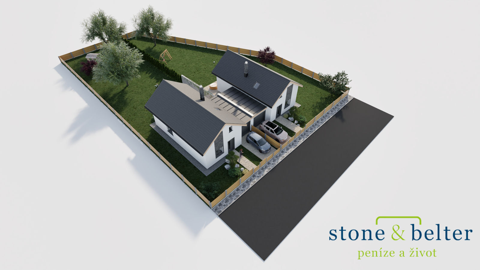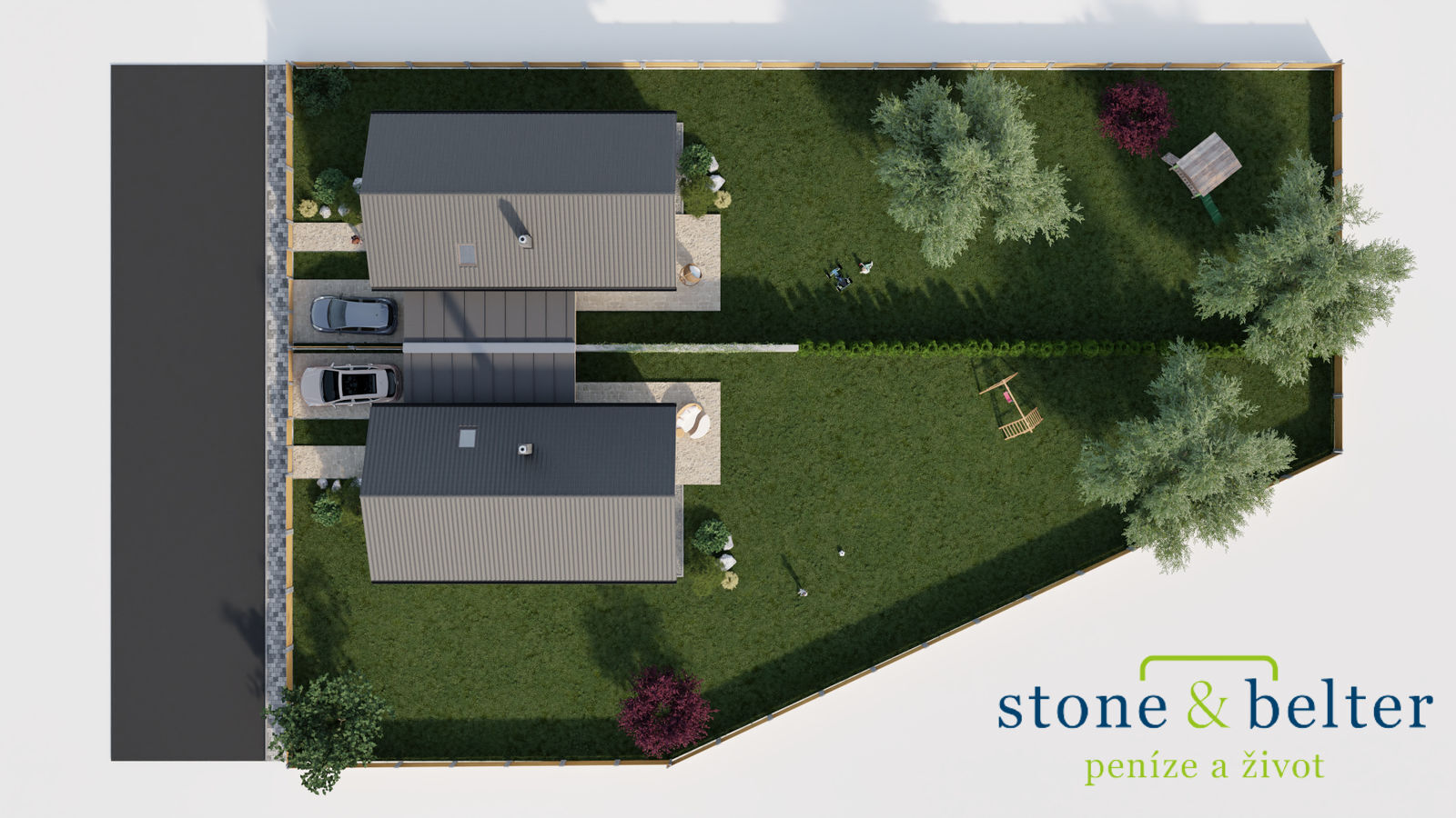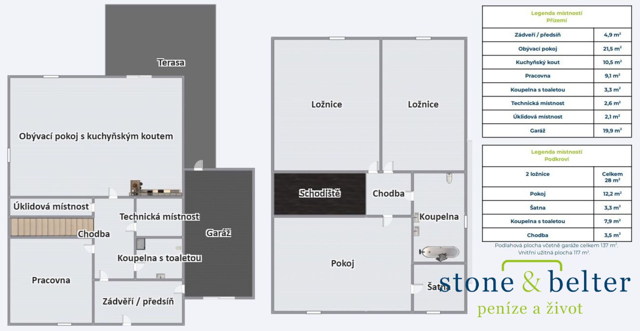 Užitná plocha domu A činí 137 m² a velikost pozemku 626 m². Užitná plocha domu B činí 137 m² a velikost pozemku 576 m² (kupní cena tohoto domu činí 7.985.000,- Kč). Garáž o velikosti 19,85 m² s vlastním vjezdem je přístupná ze zádveří / předsíně.