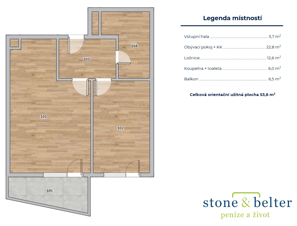 Jednotka má celkovou velikost 56,3 m² (jde o celkovou plochu včetně příček, stoupaček apod.) a skládá se ze vstupní chodby (5,7 m²), obývacího pokoje s kuchyňským koutem (22,8 m²), ložnice (12,6 m²), koupelny s toaletou (6 m²) a balkonu (6,5 m²). Okna a balkon směřují na jihozápad.