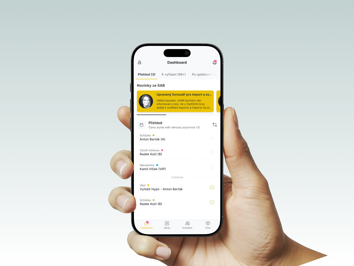 Mobilní aplikace umožňuje poradcům řešit důležité obchodní záležitosti přímo v terénu. Je plně propojená a synchronizovaná se systémem myDOCK.
